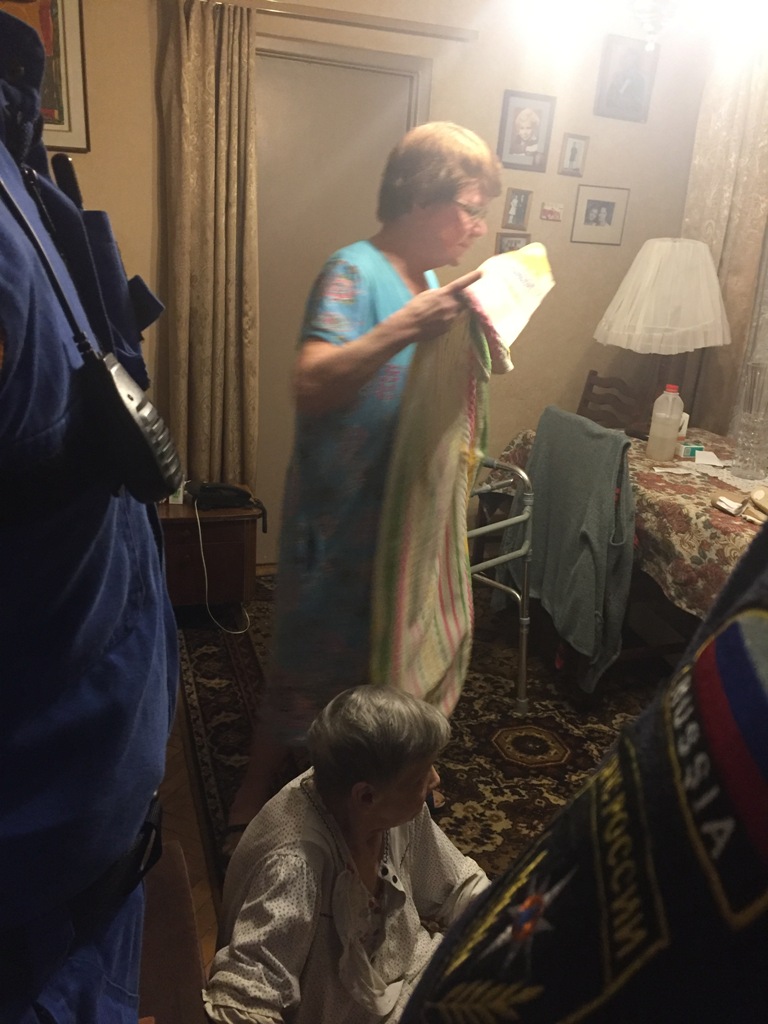 - 10-36. Ул. Елецкая. (ЮАО, Орехово-Борисово Южное) Пенсионерка, 82 года, в квартире просит о помощи. Громко кричит, плачет. Крики о помощи услышал сосед. Вызвал 03. Скорая, для вскрытия двери вызвала спасателей. Вскрыли первую дверь, сломав замок, вторую – отжали. В квартире Валентина Ивановна, состояние совершенно беспомощное. Диагноз энцефалопатия. Ситуация передана 03. - 12-37. Ул. Профсоюзная. Мужчина 30 лет с ментальными нарушениями, угрожает спрыгнуть из окна 5 этажа. На месте 38 АЦ, 203 АСО. По прибытии отправлены 0381 на разведку подхода с крыши и на установку спасательного куба под окнами. 38 АЦ вскрыла дверь, мужчина притворился спящим. Отпущены 0381. - 13-27. Ул. Ф. Полетаева. Сергей Семенович, 68 лет, упал в ванной и застрял между унитазом и стеной. На месте 03 – просят помочь. По прибытии – скорая уже перенесла инвалида на кровать. - 14-14. Театральный пр-д. Заявитель утверждает, что на веранде ресторана застряла собака. По прибытии – в элитном ресторане, во внутреннем дворе сидит крупная собака. Животное испугано, в руки не идет. Как собака попала в закрытый двор-колодец – загадка. Единственная дверь ведет в зал ресторана. Совместными усилиями загнали собаку в угол, поймали петлей. На улицу вывели через ресторан, между столиков с едой в накрахмаленных скатертях. Отпустили собаку на улице. - 16-42. Ул. М. Калитниковская. Владимир Петрович, 65 лет, после недавно перенесенного инсульта упал в ванной. Вес – около 150 кг. Супруга просит помочь. По прибытии – супруга уже вытащила его (150 кг) из ванной. На волокушах перенесли инвалида на кровать, осмотрели. Рекомендовали вызов 03. (мягкие носилки закуплены на средства гранта Президента РФ на развитие гражданского общества, предоставленного Фондом президентских грантов ) - 17-17. Ул. Ак. Скрябина. Роза Ивановна, 78 лет, в квартире, очень громко кричит, просит о помощи. Соседи вызвали скорую. Для вскрытия двери, 03 запрашивает помощь спасателей. Открыли дверь ключами дочери, прибывшей одновременно с нами. Бабушка бредит, диагноз – диабетический криз. Транспортировали в 03 в лифте на специальном транспортировочном кресле. (кресло закуплено на средства гранта Президента РФ на развитие гражданского общества, предоставленного Фондом президентских грантов ) - 22-42. Ул. Таганрогская. Виктор Александрович, 74 года, в свой день рождения упал в ванной. Встать не может. Супруга (Мария Сергеевна – 72 лет) – парализована, после давнего ДТП. Устав кричать, дедушка начал стучать по батареям. Достучался. Вместе с нами прибыл наряд 02 и 03. Вскрыли дверь, сломав замок. Супругов осмотрели. Дедушку перенесли из ванной на кровать. Ситуации передана 03. - 01-14. Университетский пр-т. ЮЗАО Раменки. Пенсионерка не может попасть домой. Потеряла ключи. Сидит в подъезде уже более 12 часов. Паспорт на руках. Вскрыли дверь, сломав замок. Бабушка предупредила, что в квартире чуть-чуть не убрано….. Лукавила. Квартира захламлена по всей площади на высоту не менее метра. - 04-26. Красногвардейский пр-д. Инвалид, 76 лет, упал в своей квартире. Сиделка помочь не в силах. Приехав - осмотрели, подняли.